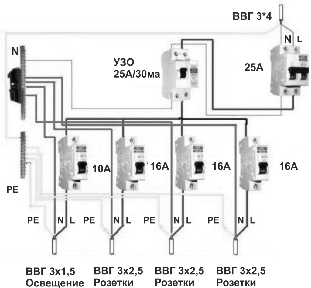 В подавляющем большинстве случаев внешнее подключение выполняется медным кабелем с сечением жилы 10 мм2, разводка освещения выполняется кабелем с жилами в 1,5 мм2, а розетки подключаются с использованием кабеля, который может иметь жилы сечением 2,5 мм2 или 4 мм2 (в зависимости от расчетных нагрузок).