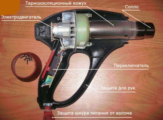 - Термозащитный кожух, который находится на трубе, через которую поступает воздух, может быть как съемным, так и несъемным. Он защитит руки рабочего от ожогов, а съемный тип станет удобным при использовании в труднодоступных местах.