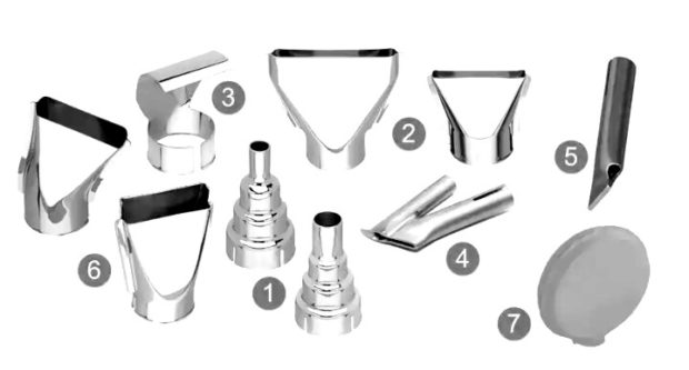 - Круглые насадки оптимально использовать для пайки или разогрева медных труб или герметизации изделий с помощью сварочной ленты (№1 на рисунке)