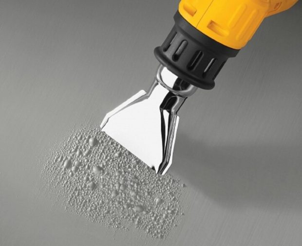 - Вы сможете без труда удалить слой старого лака, краски, обоев и других материалов с любой поверхности, используя специальный шпатель-скребок. Поток горячего воздуха расплавит старое покрытие, и вы сможете снять его гораздо быстрее, чем другими способами.