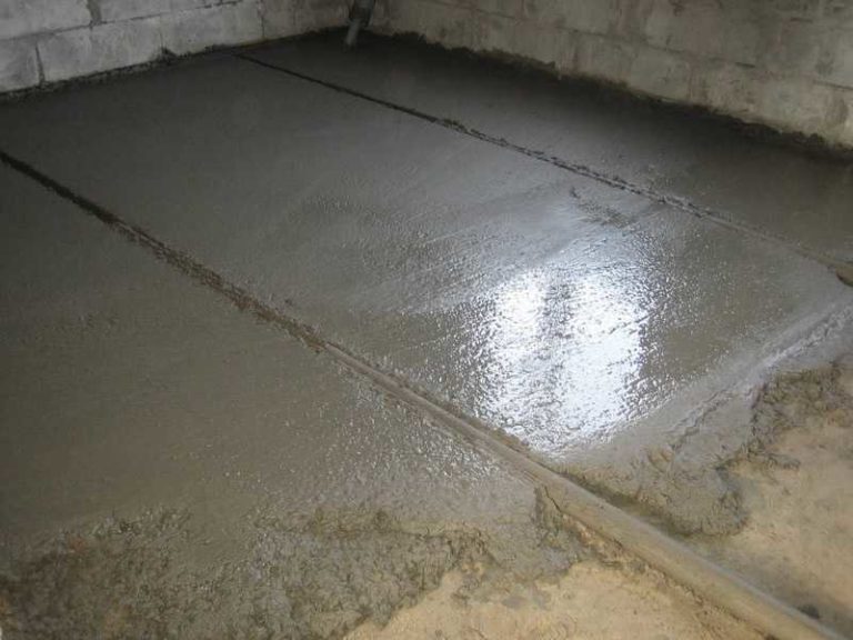 - Собственно бетонный пол: стяжка, утепление и гидроизоляция, приблизительно 10 – 12 см толщиной.